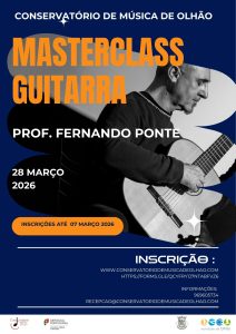 O Conservatório de Música de Olhão promove uma Masterclass de Guitarra com o Prof. Fernando Ponte, guitarrista e pedagogo de reconhecida experiência, proporcionando uma oportunidade única de aprendizagem e aprofundamento artístico.