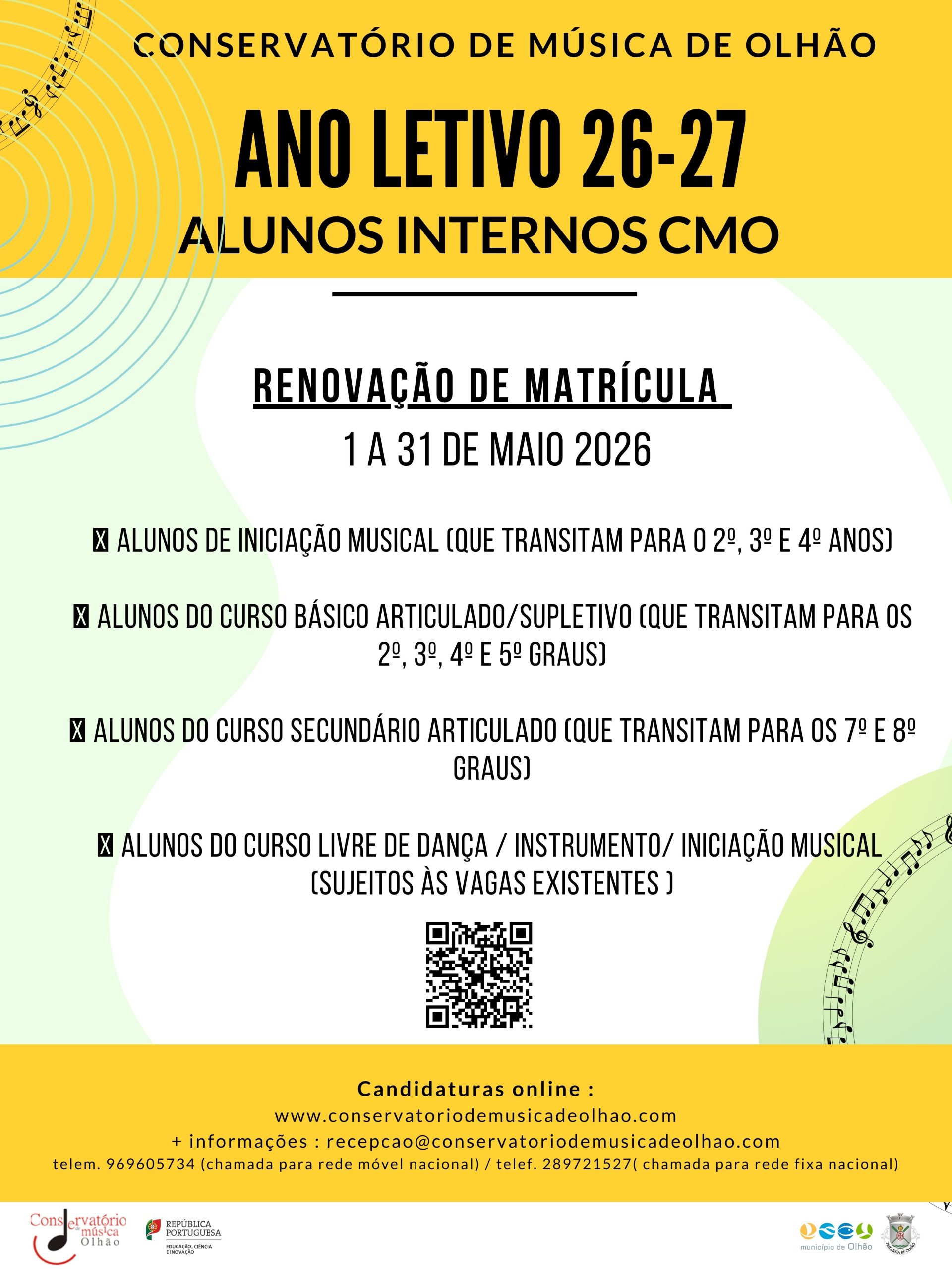 O Conservatório de Música de Olhão informa que se encontram abertas as candidaturas para admissão de novos alunos aos cursos do Ensino Artístico Especializado da Música para o ano letivo 2026-2027.